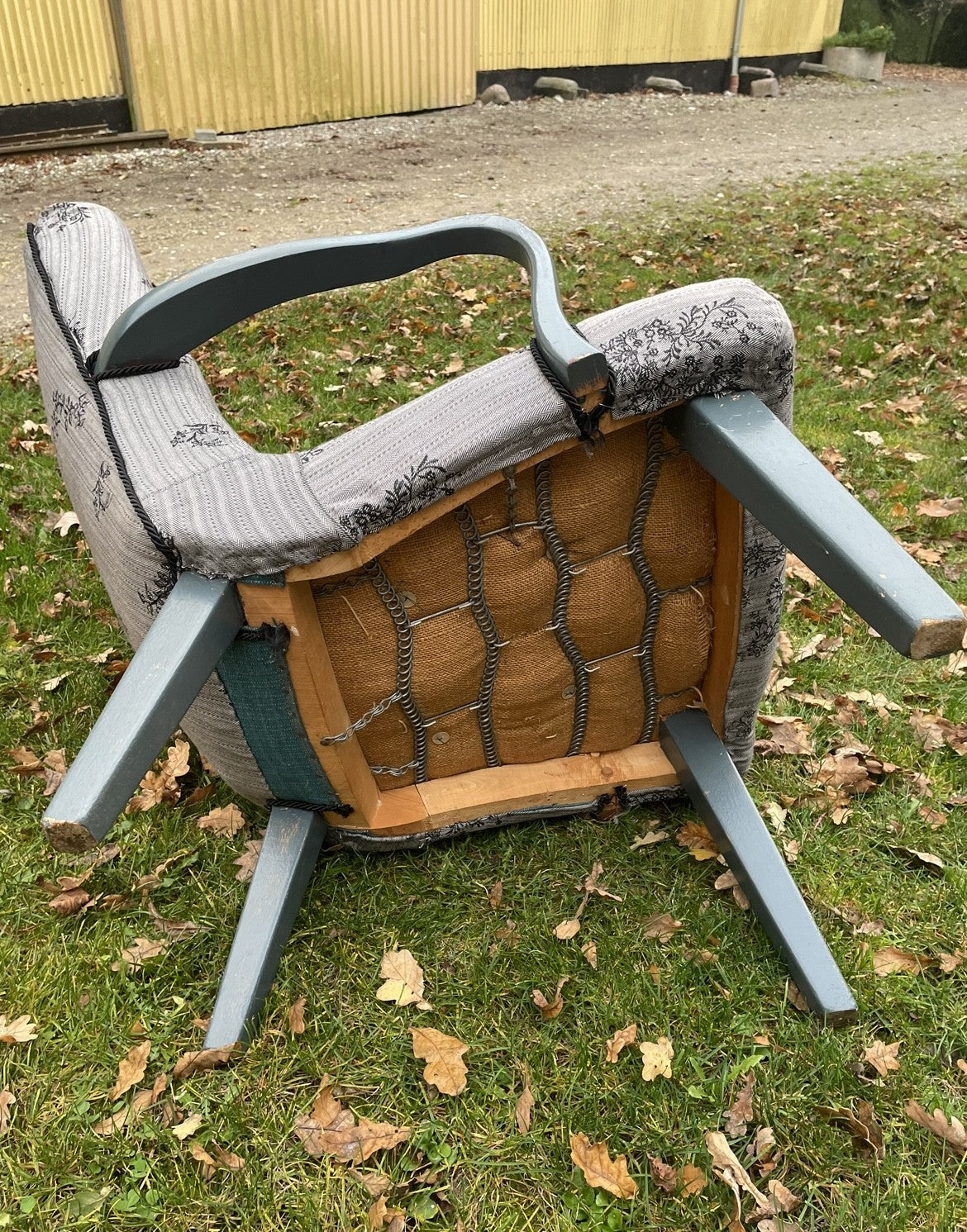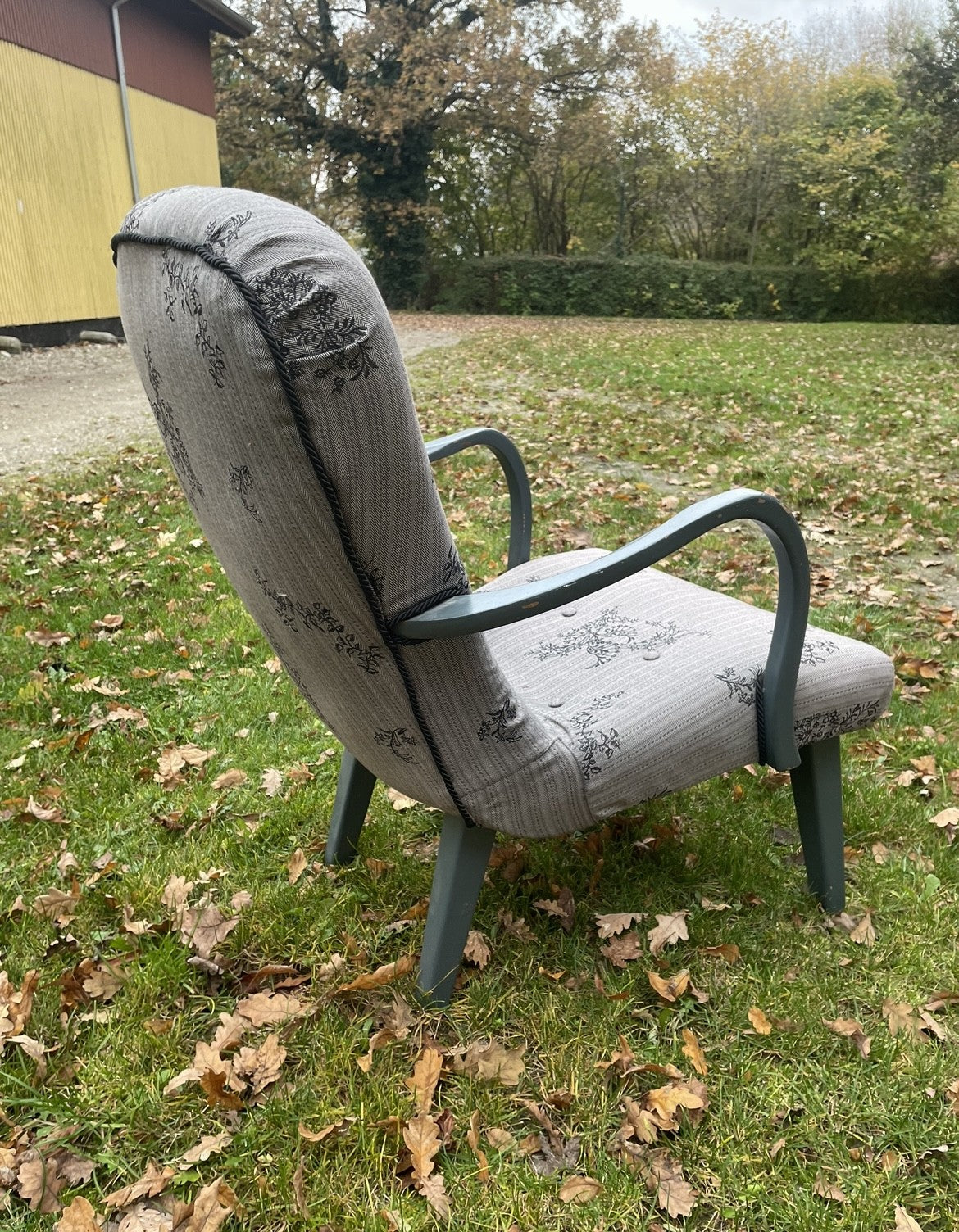 Armlæn og ben er blevet malet, og der er nyere betræk på. Få aldersrelateret brugsspor