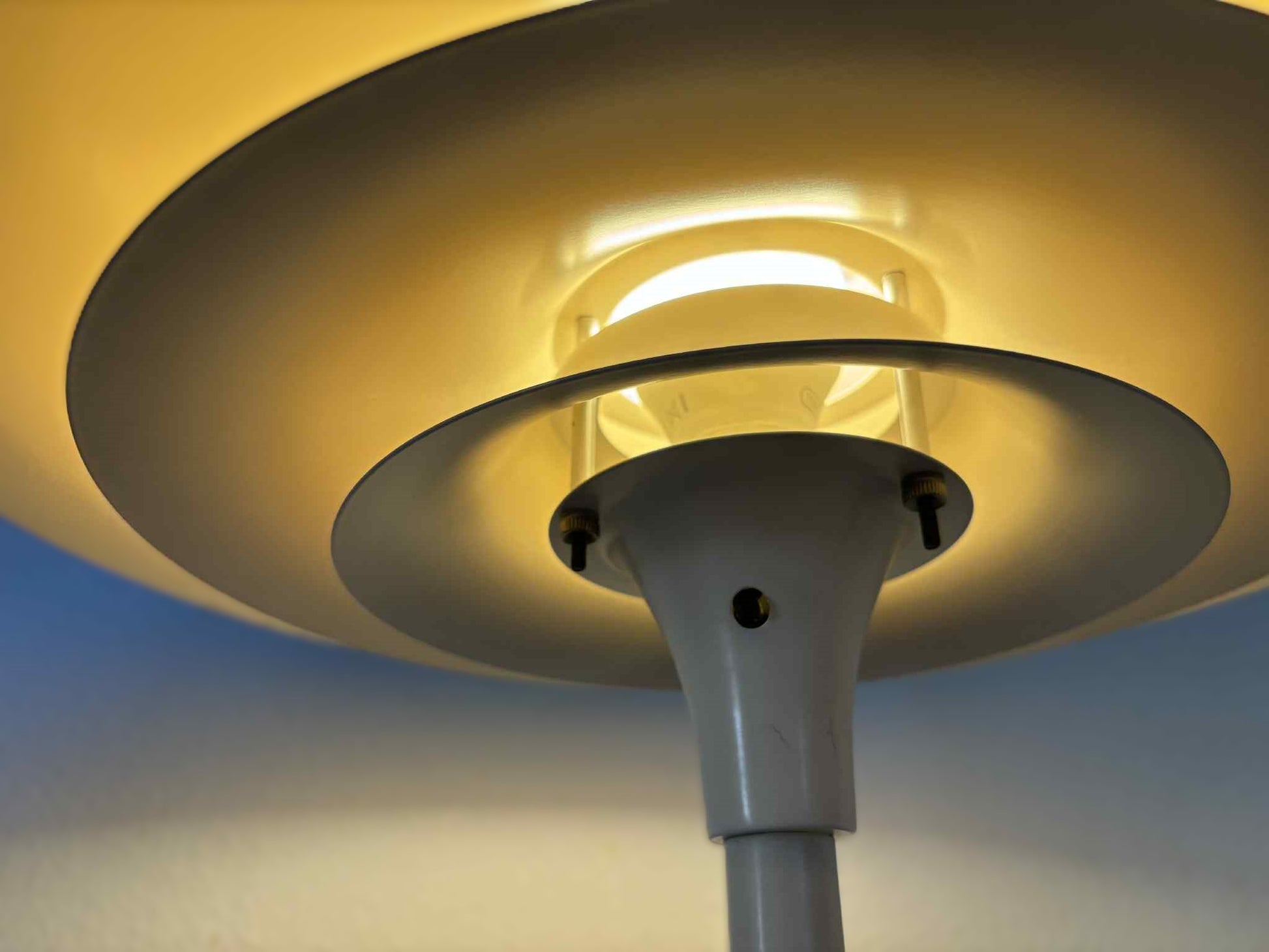 Højde: 130 cm. Skærm diamater 50 cm. Fremstår med få aldersrelateret brugsspor, og i funktionel stand.