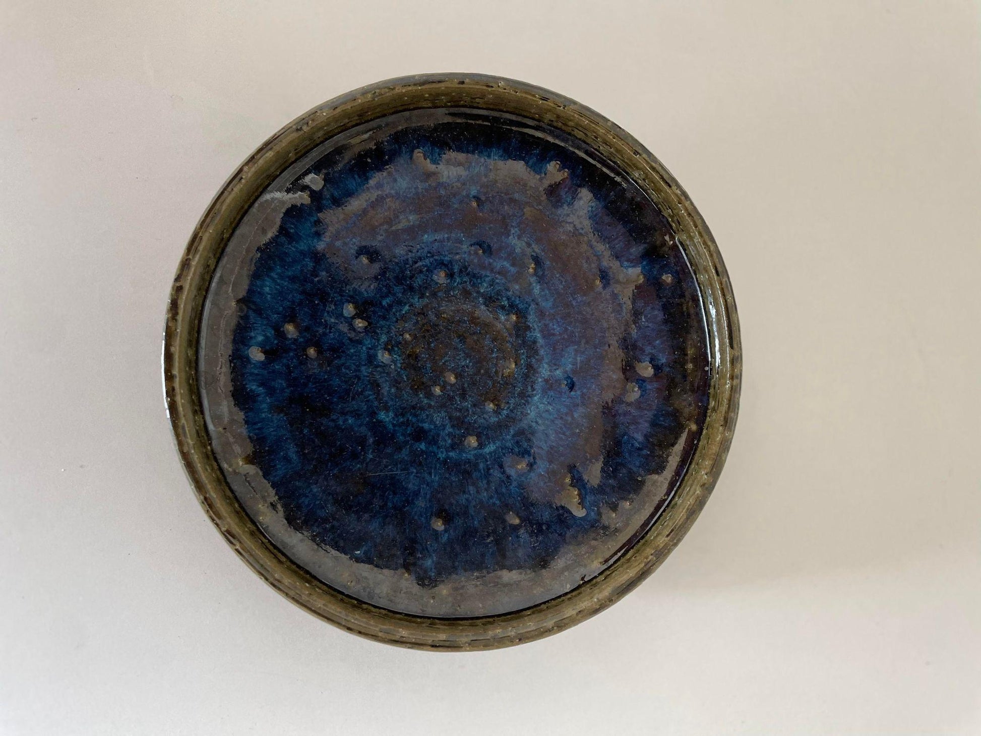Ceramic Vide-Poche or Low Bowl in Olive Green Tones With A Subtle Blue Flame in the Center. It comes with a thick glaze.