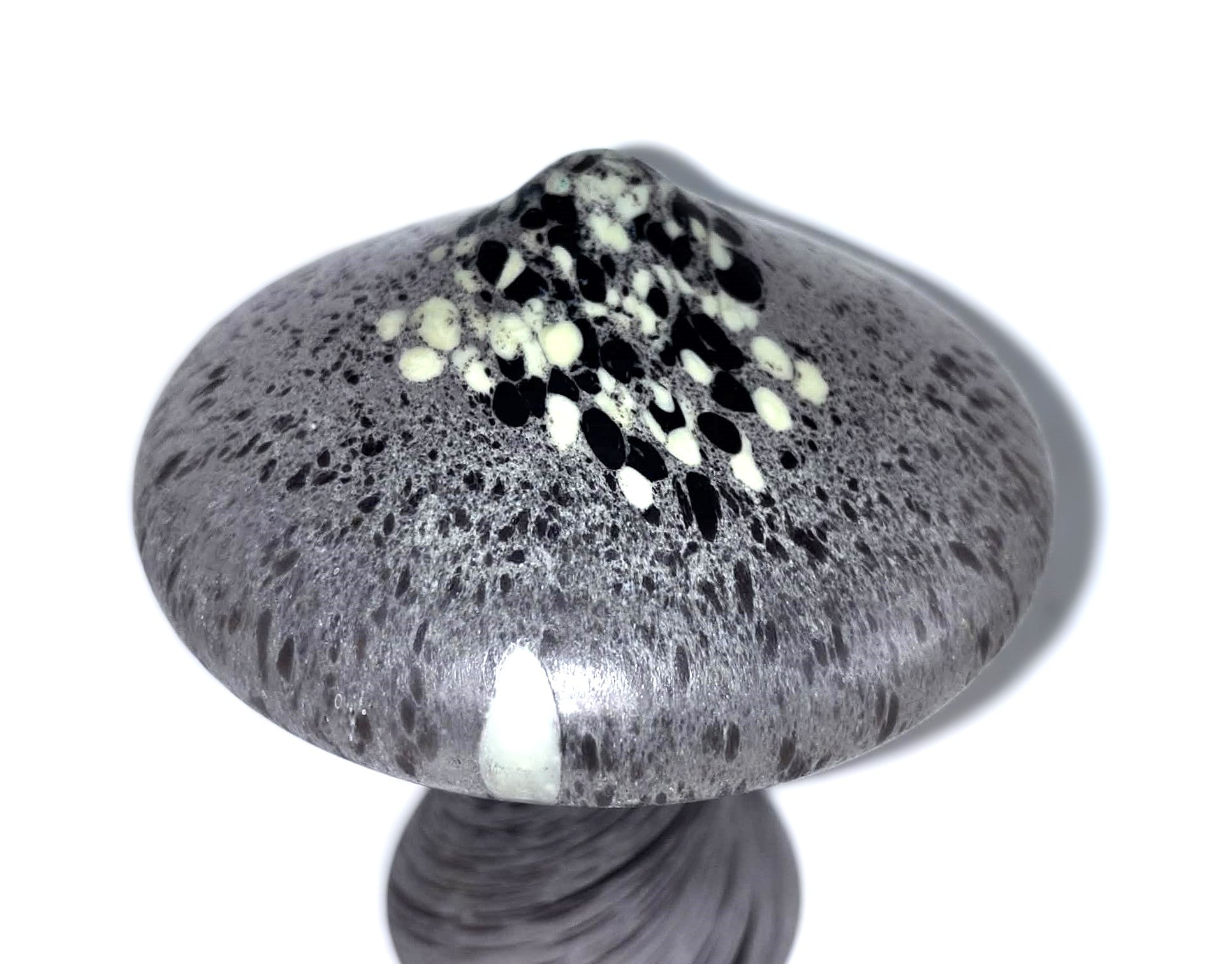A rare glass sculpture in the form of a Mushroom, designed by Monica Backström for the iconic Swedish glassworks Kosta Boda. The mushroom-shaped shade features a multicoloured pattern in tones of brown, purple, white, and lime green.