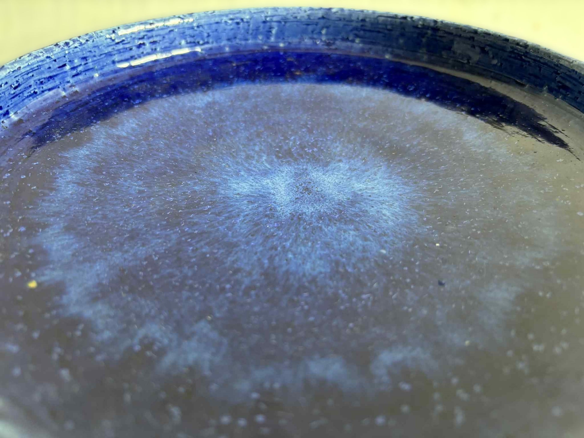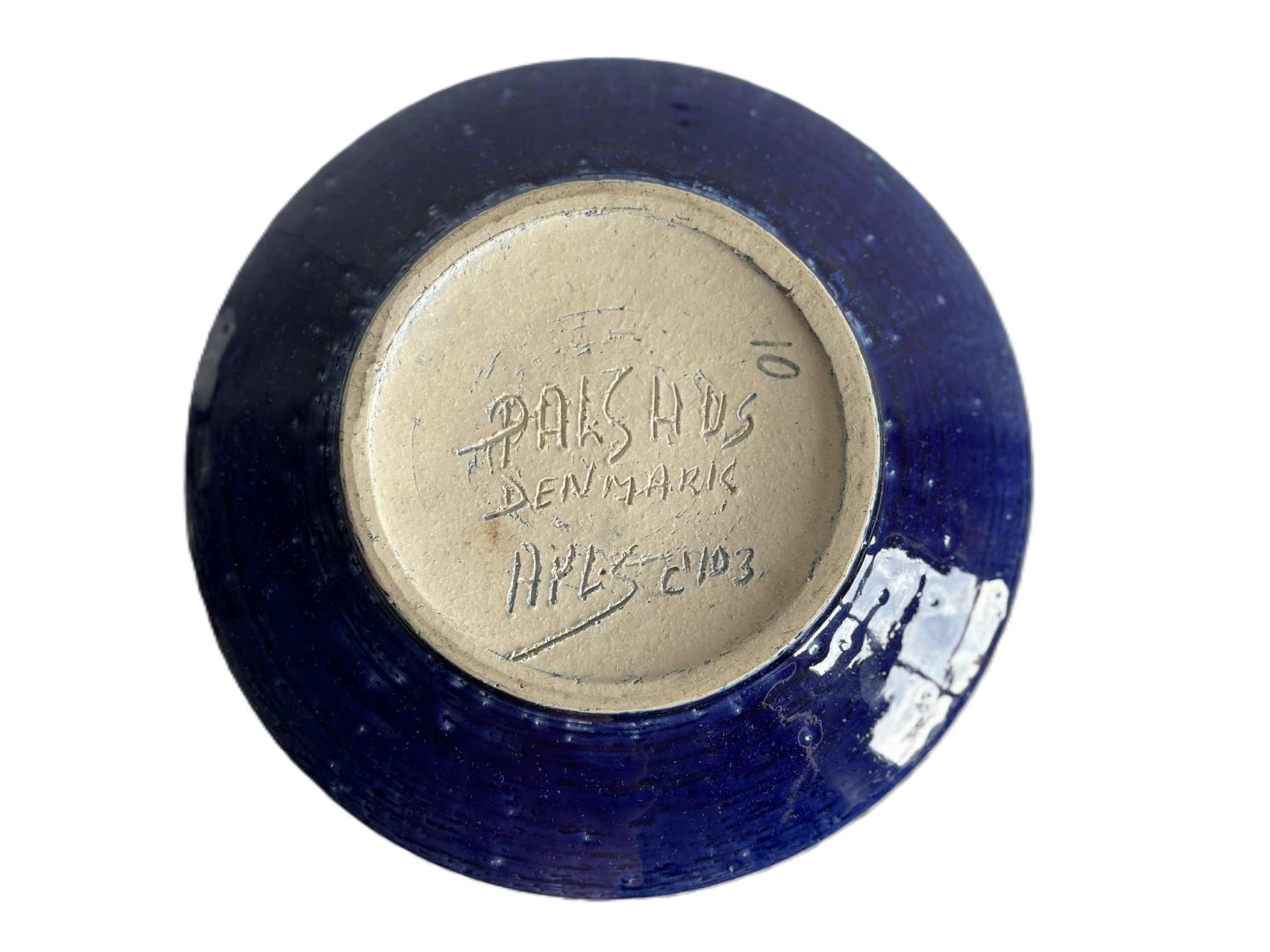 Height 4.5 cm // 1.77" It comes in blue tones from light to royal blue with a thick glaze. Produced by Palshus (Denmark) in the 1960s, founded by Per and his wife Annelise Linnemann-Schmidt. The couple created and produced chamotte (danish clay) objects, often with impressed decorations (tableware, vases, and lamps).