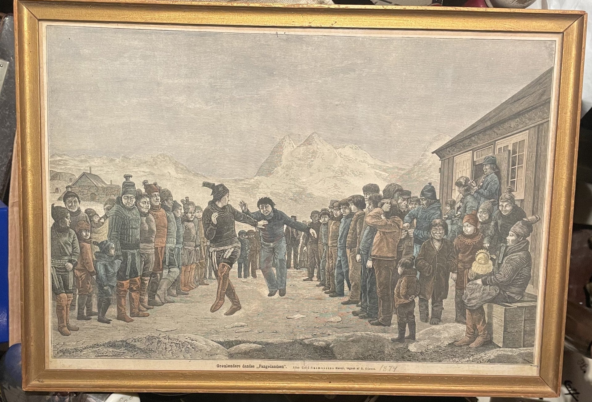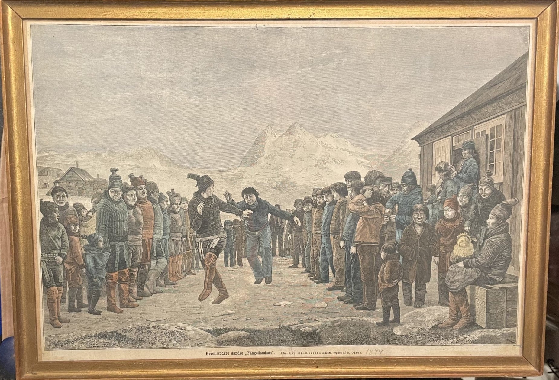 Beautiful Greenlandic color etching, drawn by B. Olsen, after Carl Rasmussen's painting "The Prisoner's Dance" - no. 021300