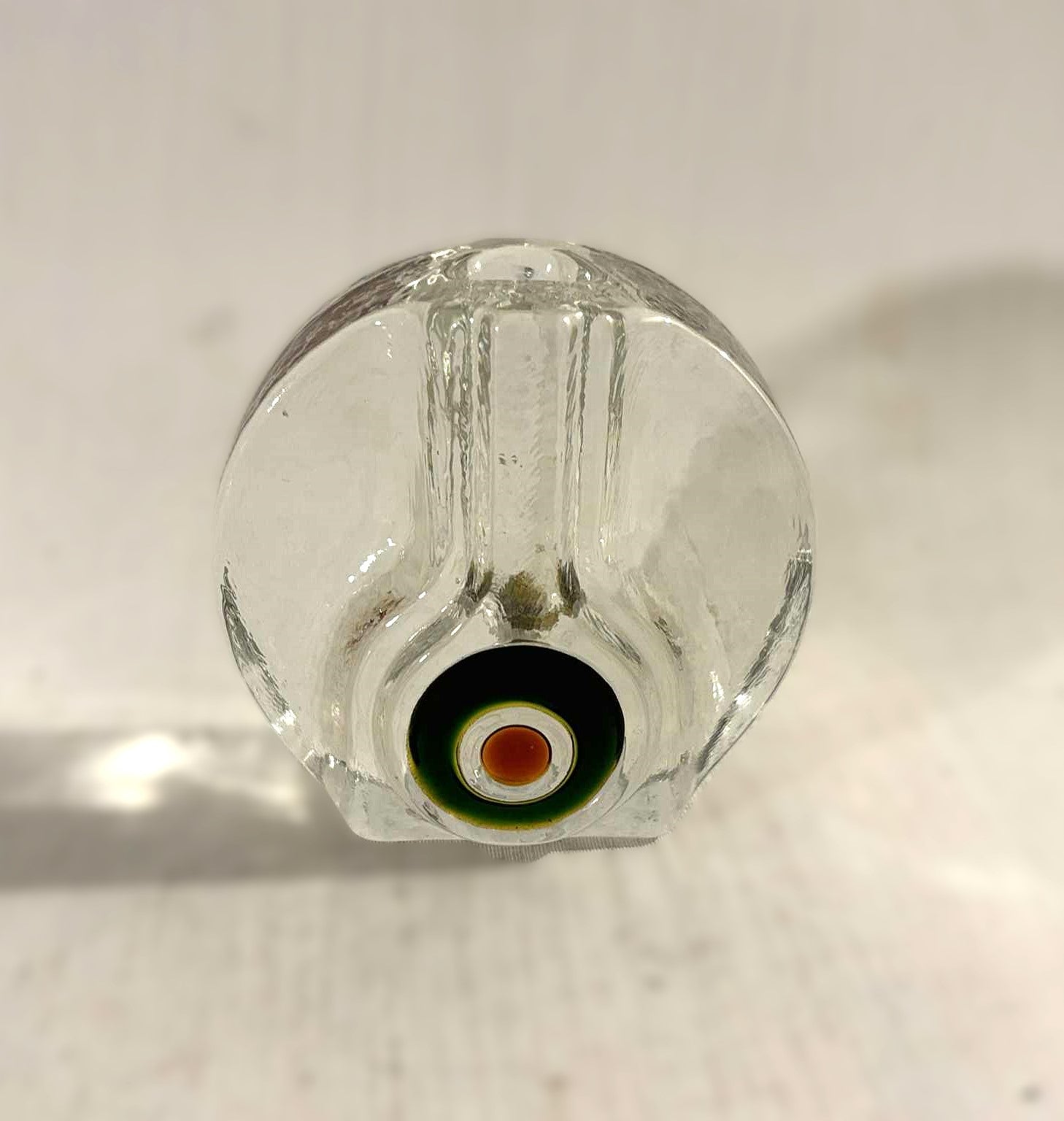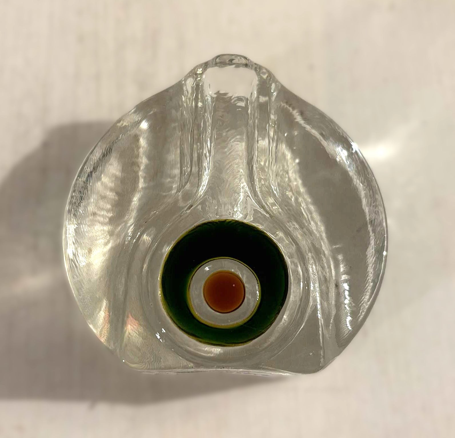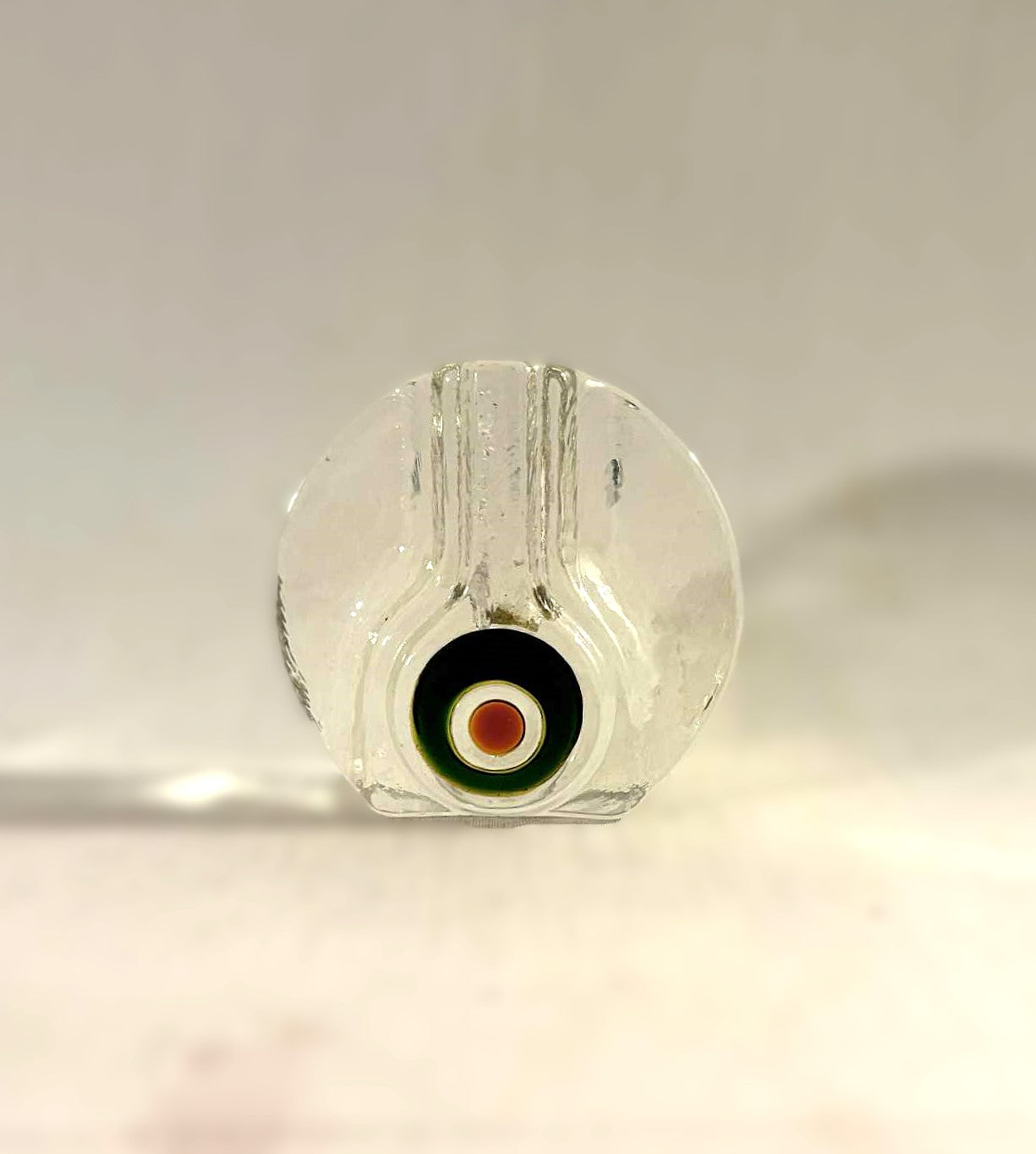 Beautiful glass vase with a curved shape and a colorful "Bullseye" in green, red and white nuances.