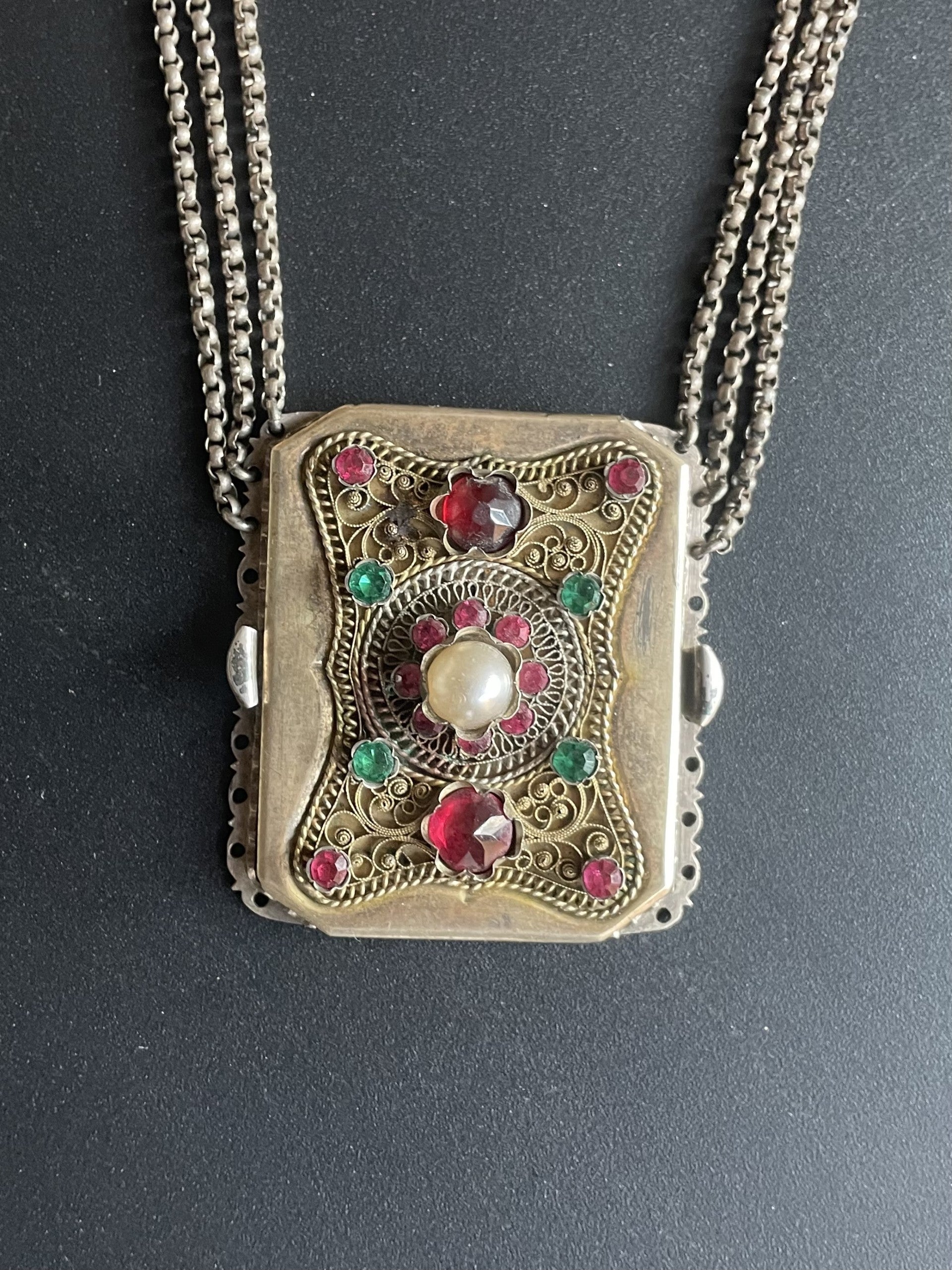 Spectacular Antique Victorian gold gilt and silver (dual tone ) Choker necklace featuring central large pendant which acts like a clasp has applied fine silver filigree work on gold gilt background with pave paste /glass stones and faux pearls, which is connected by 3 chains . The central clasp can be removed from the necklace, as it has two hidden tongue and box clasp. Unmarked but acid tested for atleast 800 silver.