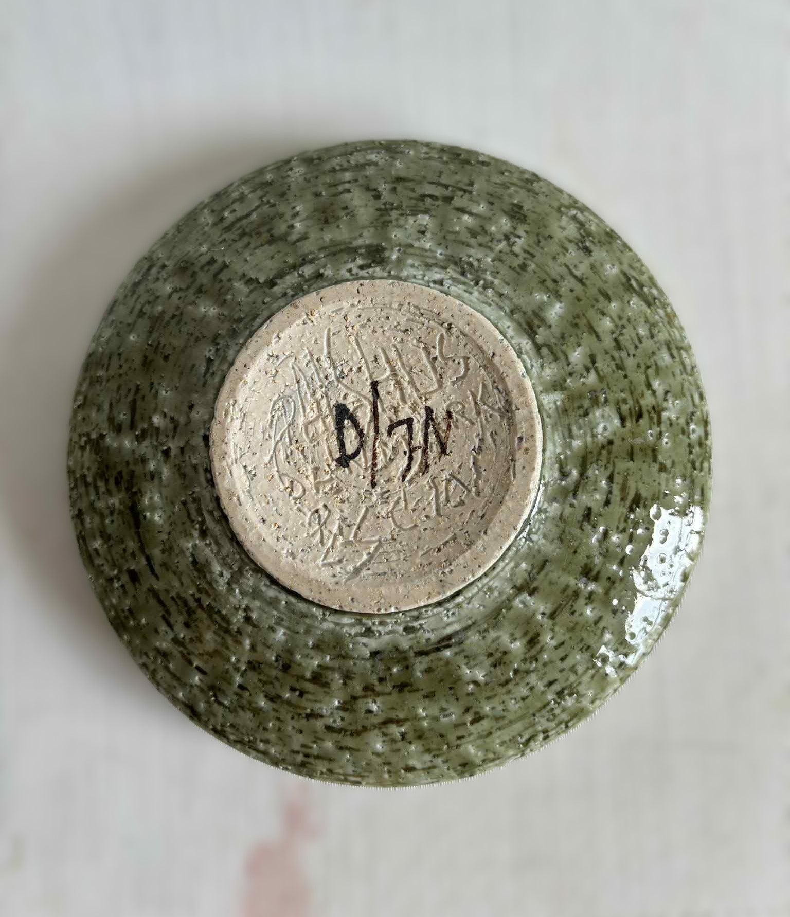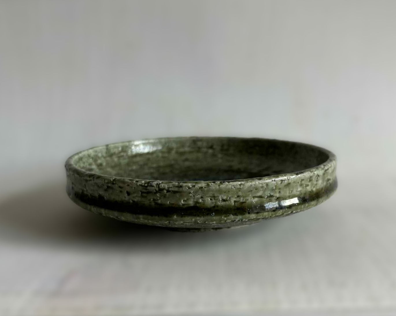 Ceramic low bowl in olive green tones with a subtle light blue flame in the center. It comes with a thick glaze.