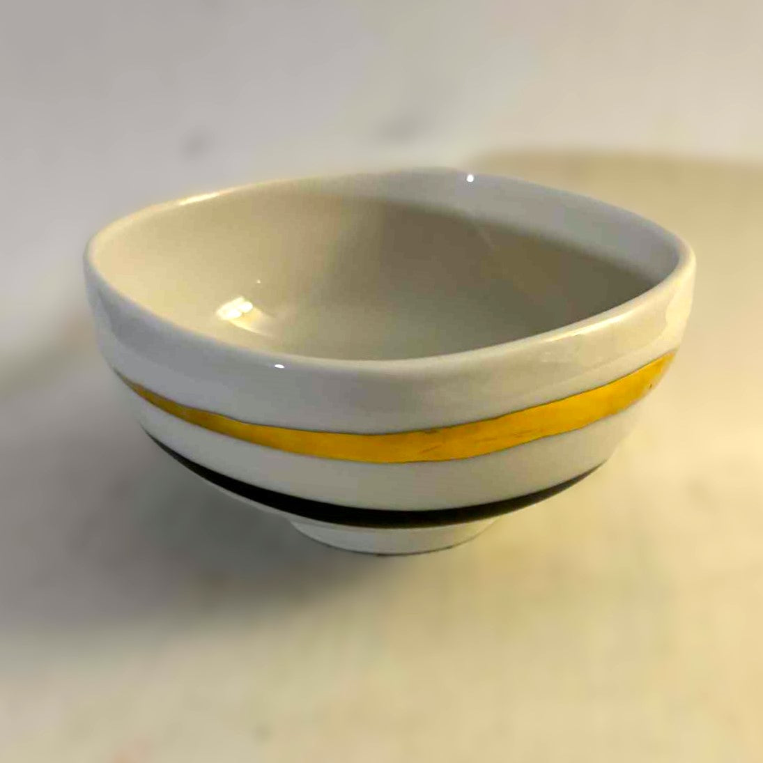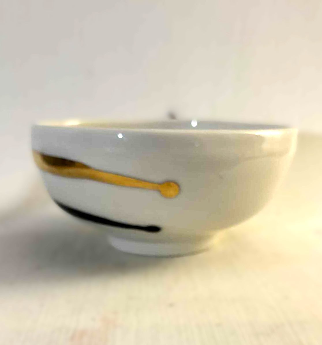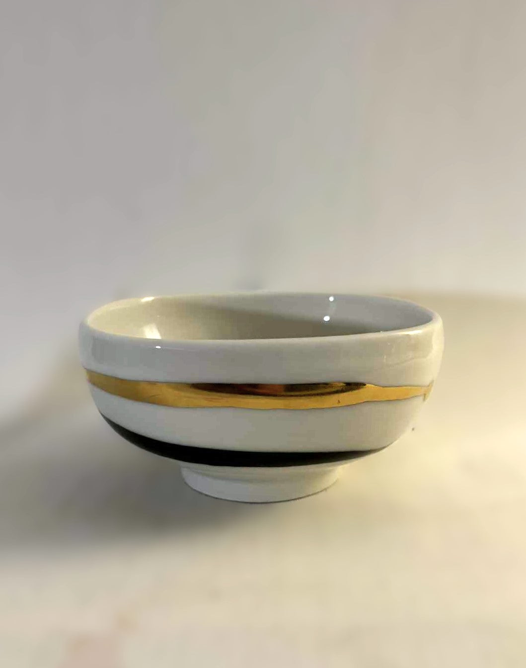 Skål i hvidt porcelæn med sort og guldfarvet dekoration.