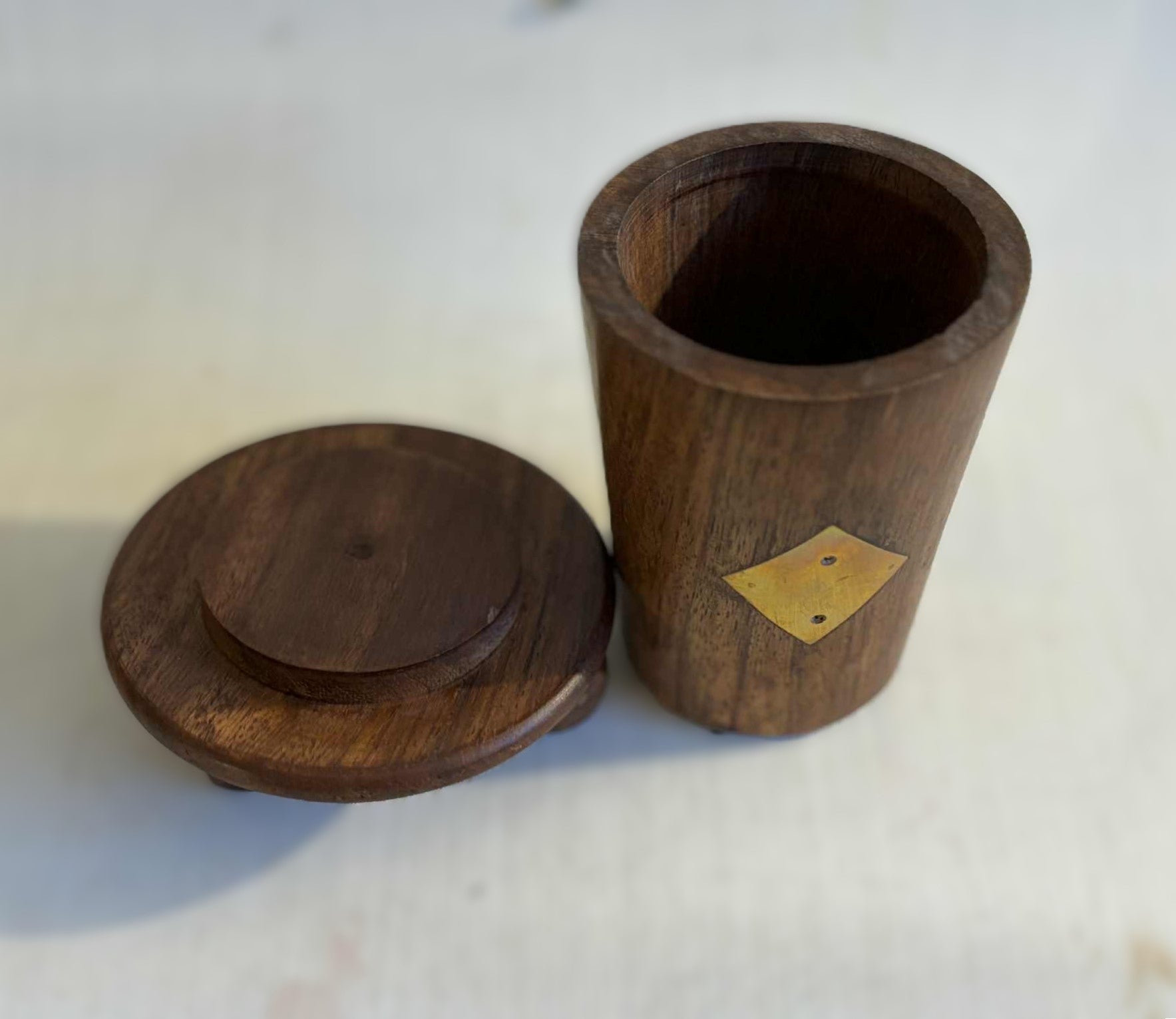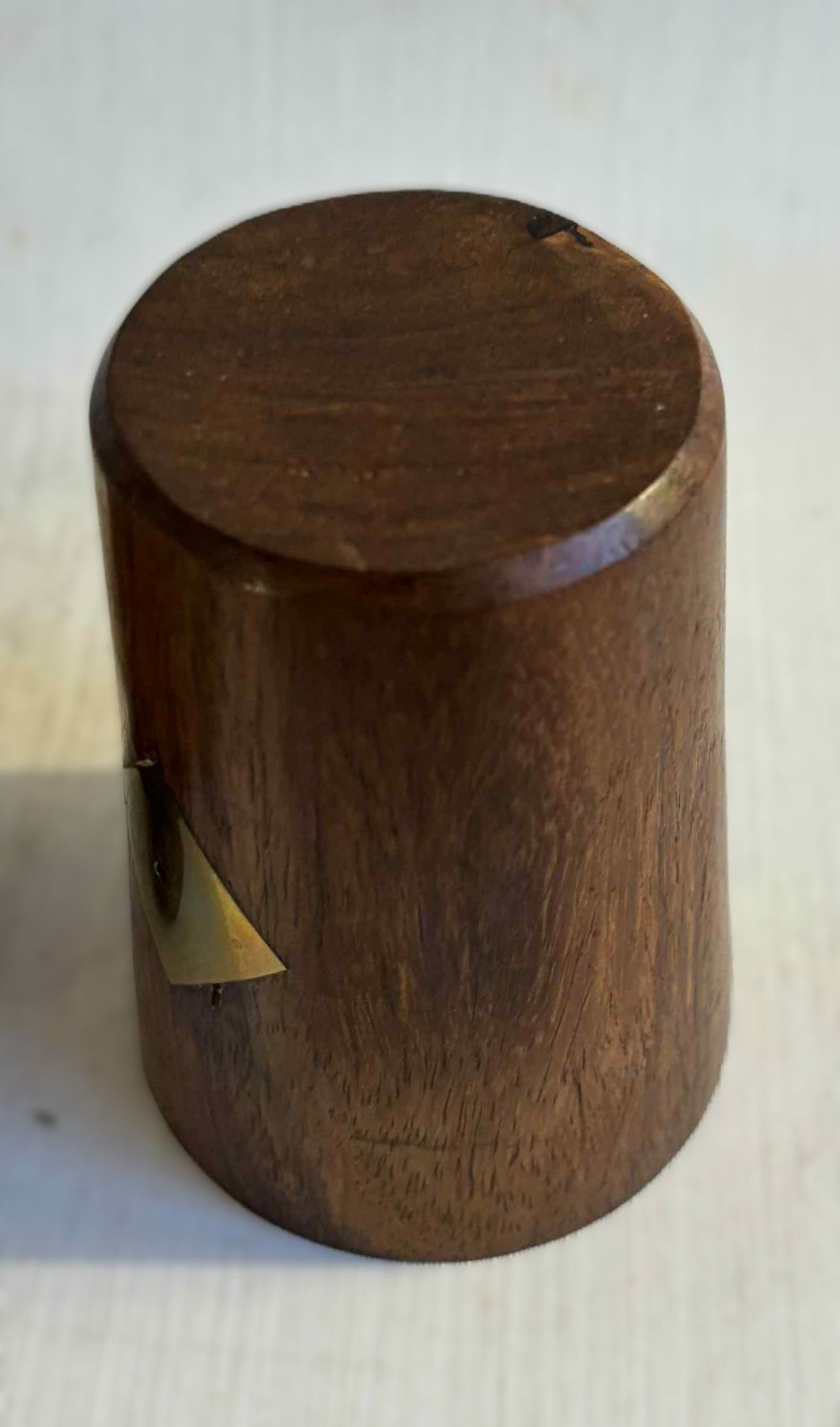 Flot retro raflebæger udført i Teaktræ og med dekorative messing 'terninger' som udsmykning.