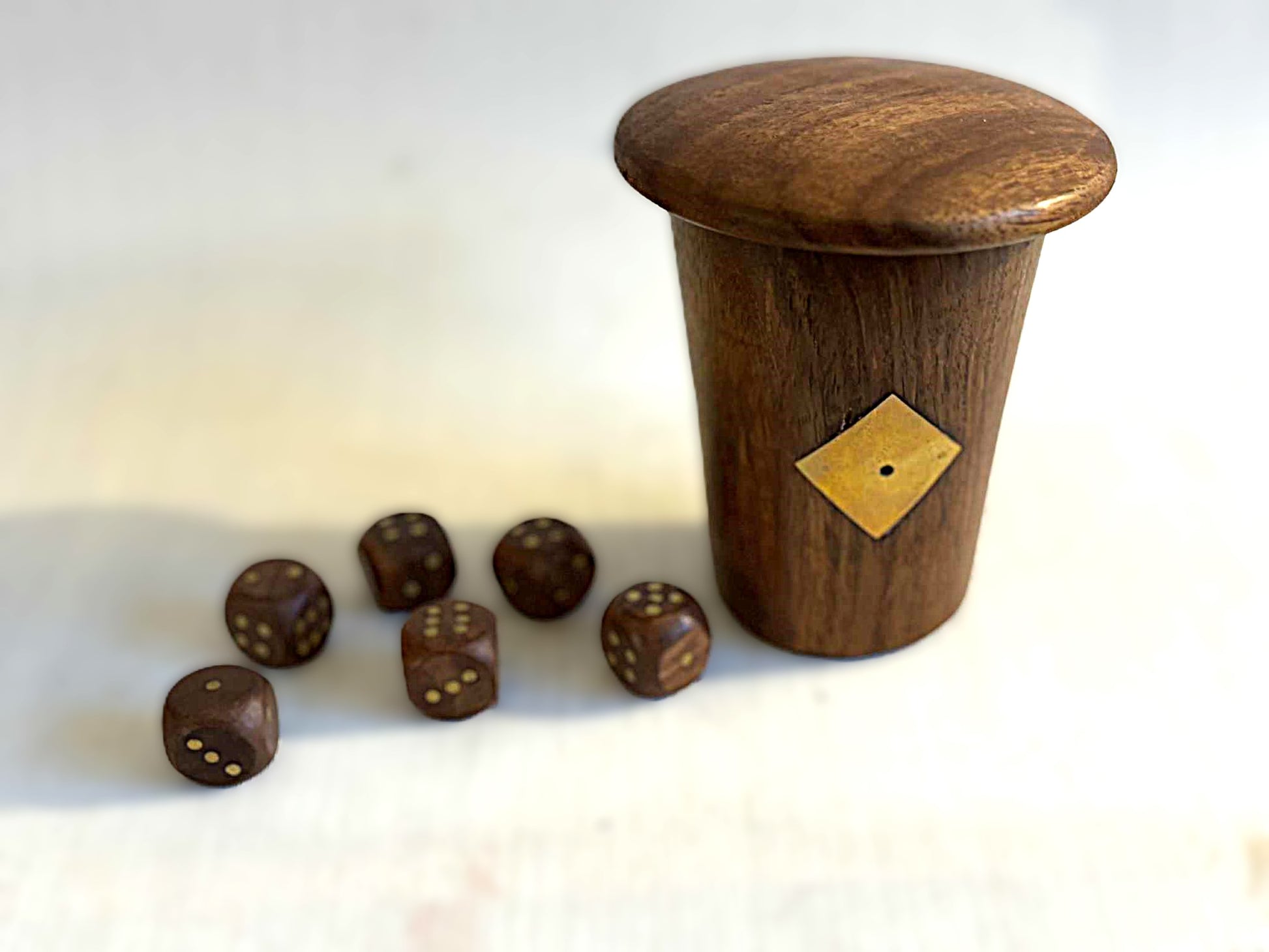 Der medfølger 6 terninger, ligeledes i teaktræ.