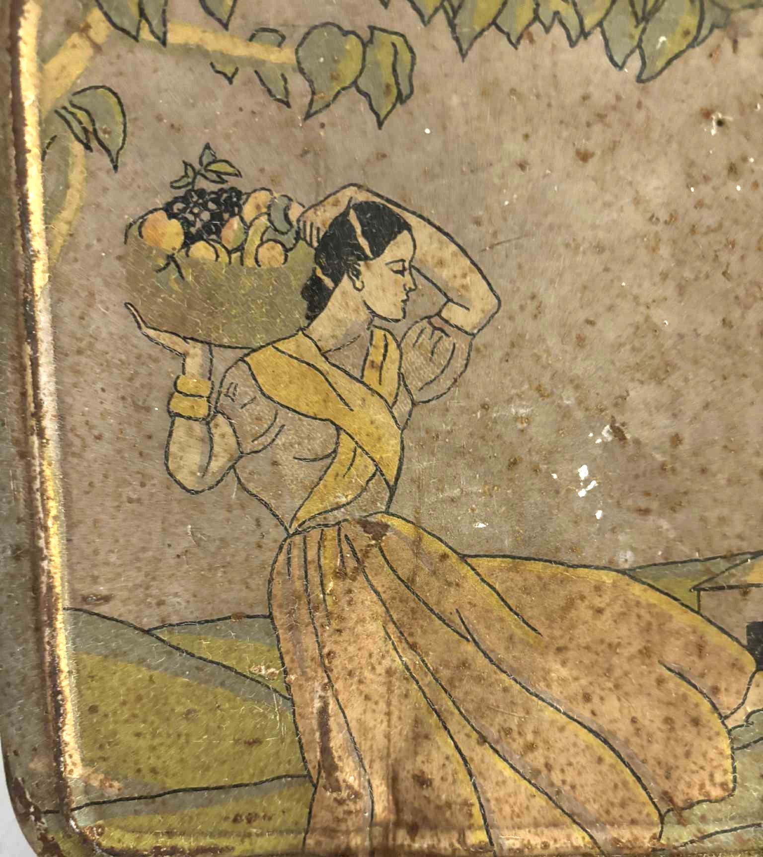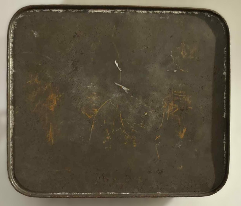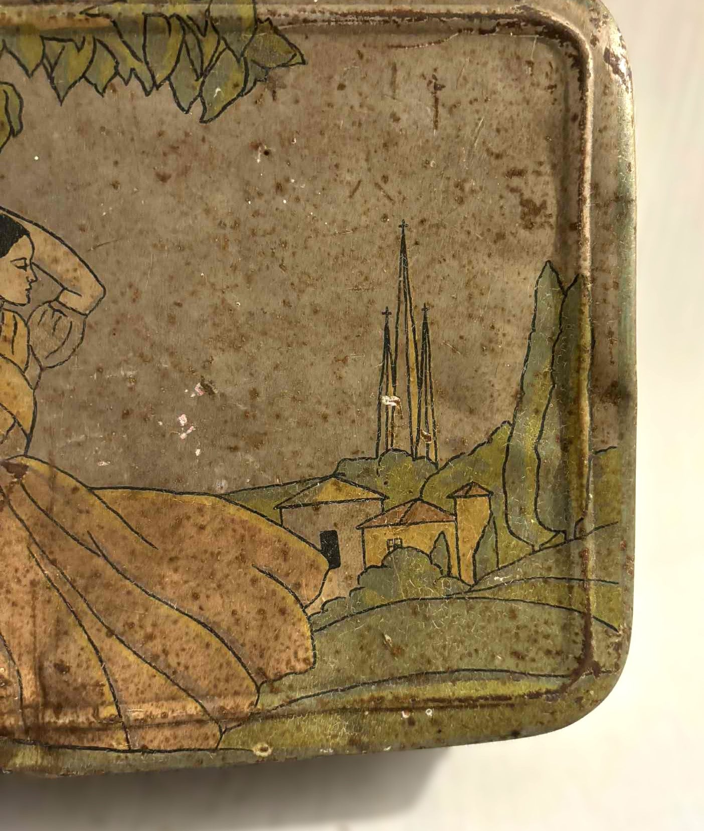 Tinæsken er udført i Art Deco stil fra 1930erne, og har sandsynligvis været anvendt til småkager, konfekt eller andre søde sager.