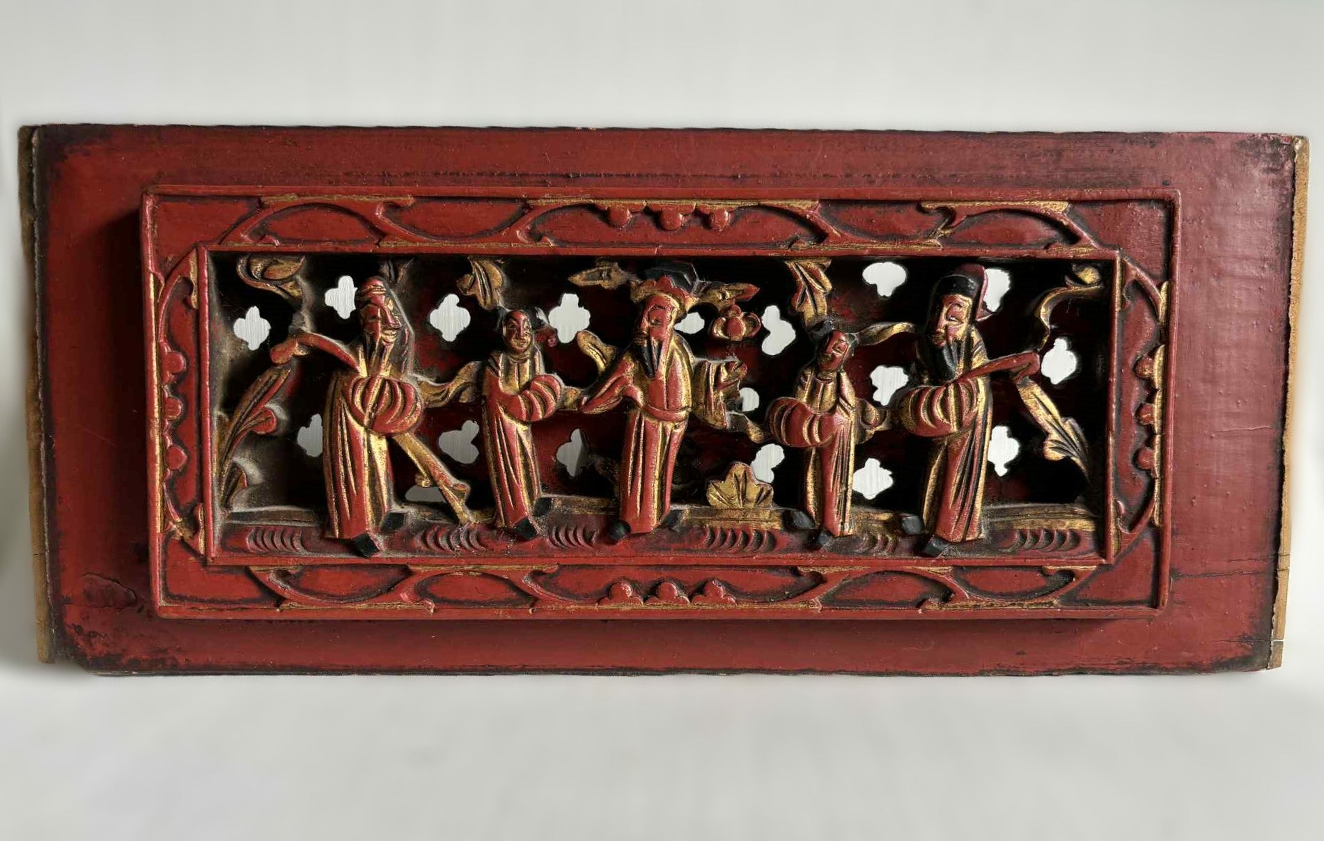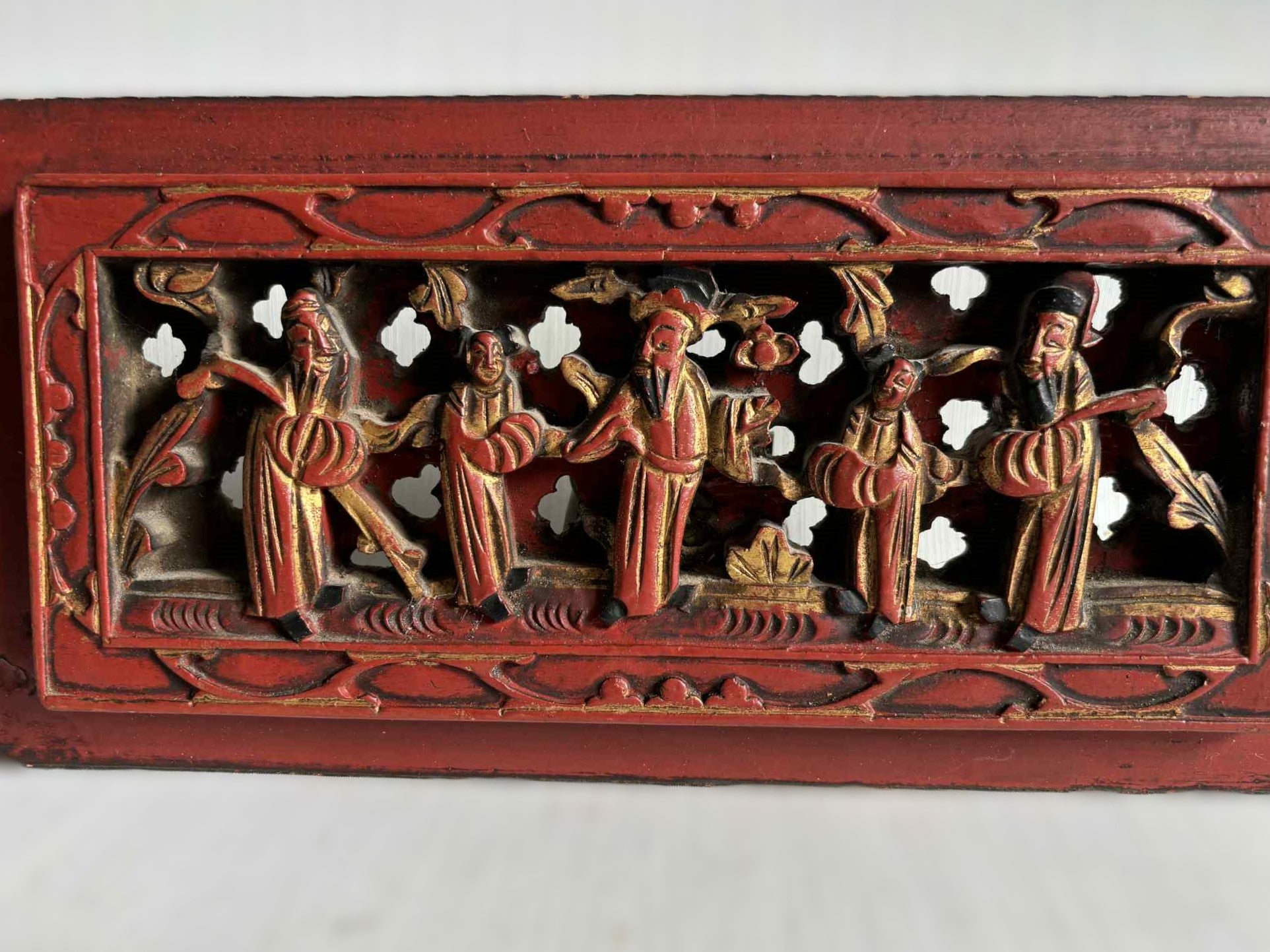 To kinesiske forgyldte træreliefer, udskåret med fine dekorationer. Qing cirka 1900 tallet.